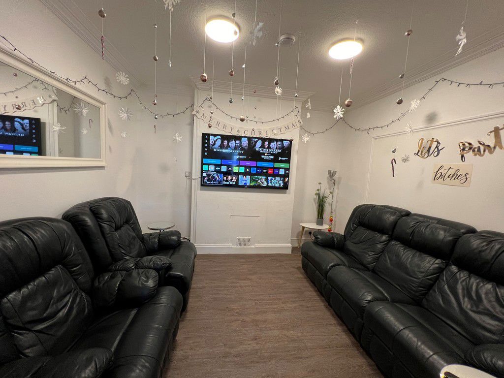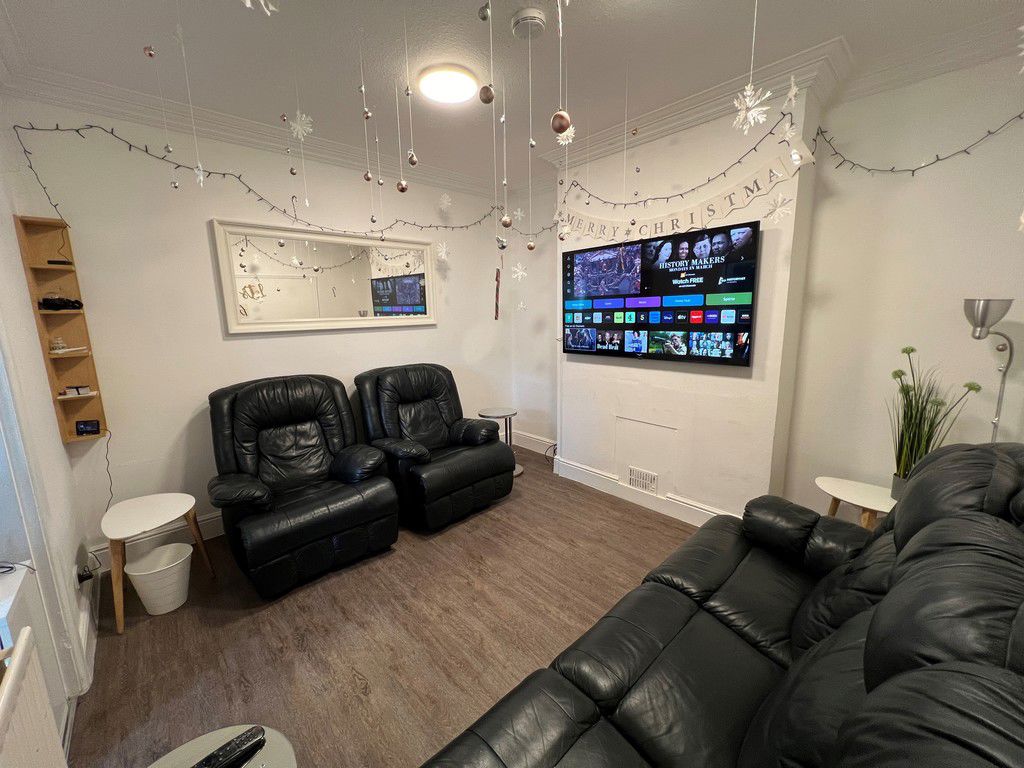 Cosy lounge fitted with plenty of seating, coffee and side tables as well as a wall mounted smart Tv.